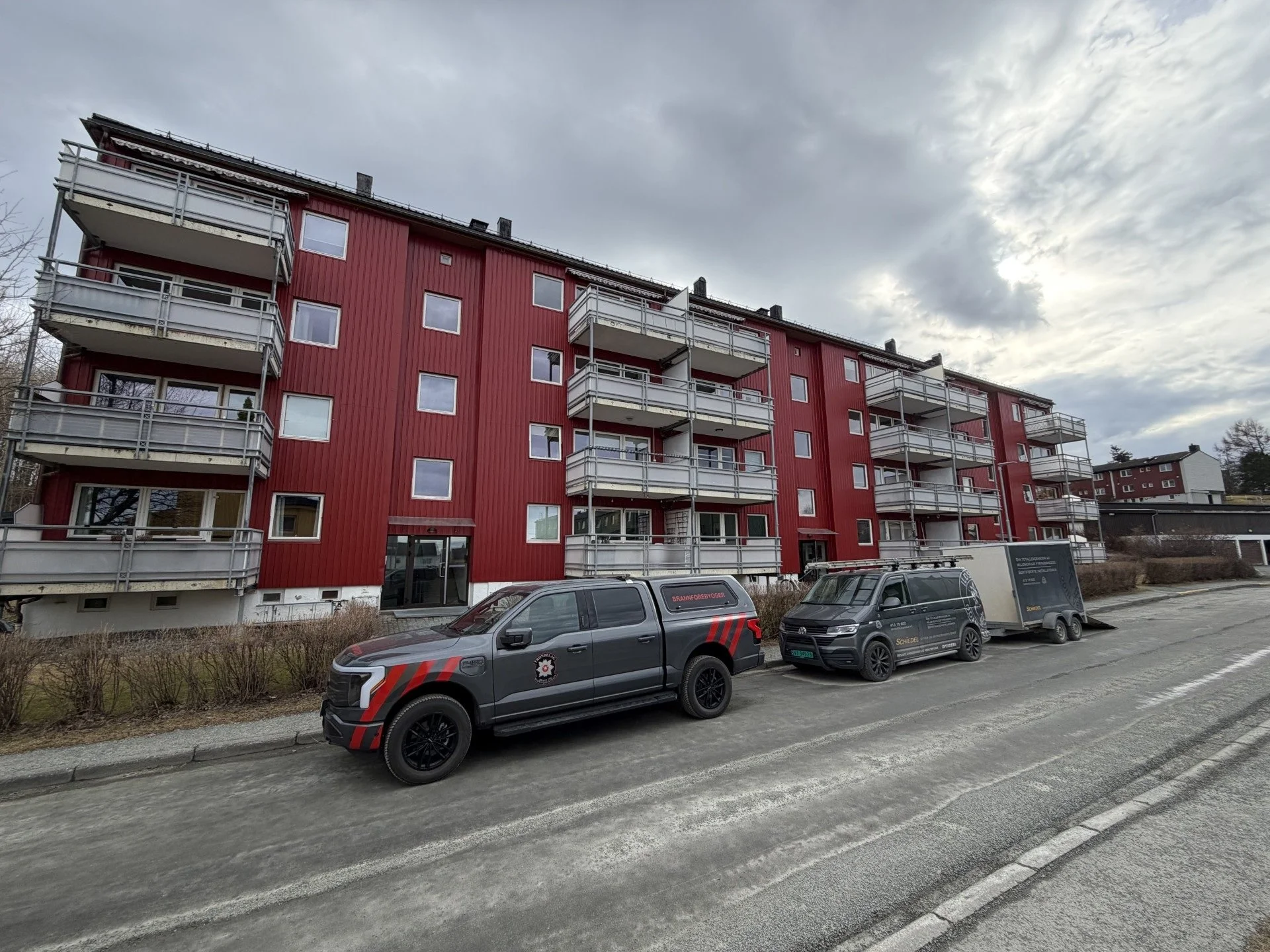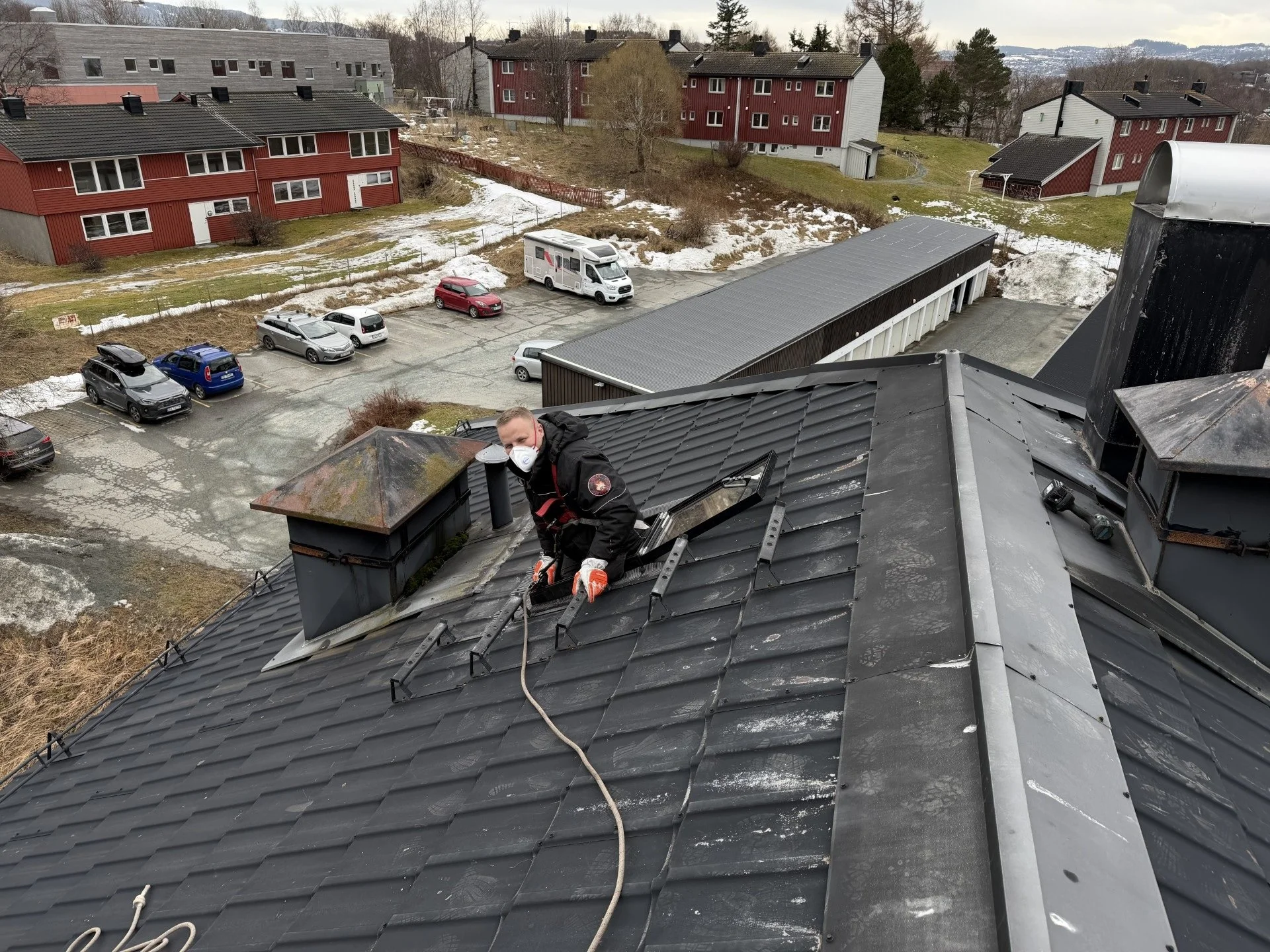 Pågående rehabilitering av skorsteiner i Østmarka Boliglag.