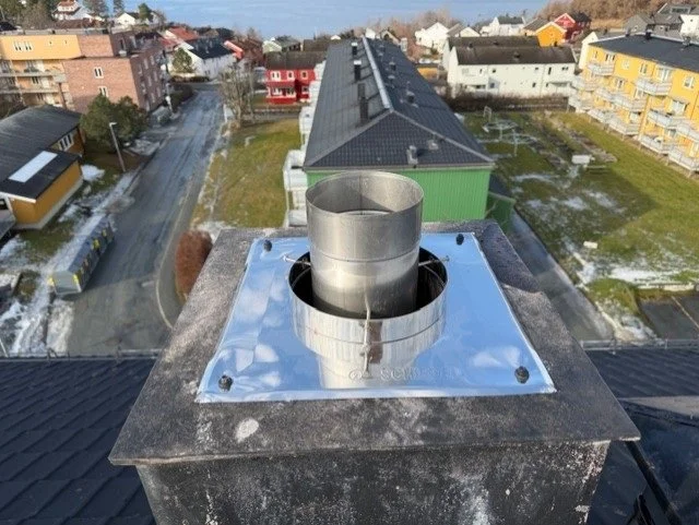Etter en omfattende koordinering med beboere i alle leiligheter ble vi klare til å rehabilitere samtlige skorsteiner med syrefaste stålrør i full høyde - en effektiv og rimelig metode for å gi nytt liv til en eksisterende røykløp, uten omfattende riving- og fasadeenring.